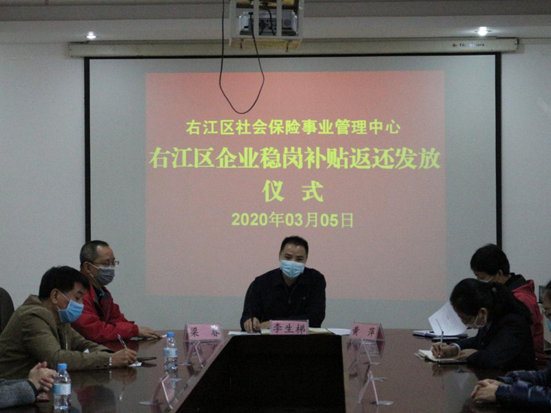 ??? 3月5日,在右江區(qū)社會保險(xiǎn)事業(yè)管理中心召開穩(wěn)崗補(bǔ)貼返還工作會議暨企業(yè)穩(wěn)崗補(bǔ)貼返還發(fā)放儀式,我公司作為首批返還企業(yè)代表之一應(yīng)邀參加,會上社保中心主任李生梯對我公司響應(yīng)穩(wěn)崗補(bǔ)貼政策給予高度肯定,期望通過穩(wěn)崗補(bǔ)貼返還為公司的穩(wěn)定復(fù)產(chǎn)助力。截止目前,我公司有8家子公司符合享受失業(yè)保險(xiǎn)穩(wěn)崗返還補(bǔ)貼條件,獲得穩(wěn)崗返還補(bǔ)貼3.6萬元,惠及企業(yè)員工約150人。(通訊員:黃 芬)