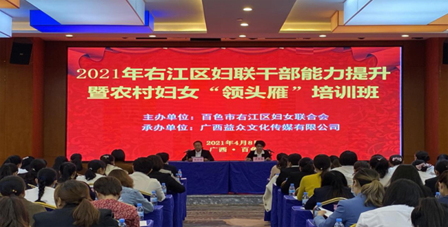 ????????為提高新一屆村(社區(qū))婦聯(lián)主席業(yè)務(wù)水平和履職能力,提升婦女干部的內(nèi)在素質(zhì),盡快進(jìn)入婦聯(lián)工作角色,4月8日至9日,百色市右江區(qū)婦女聯(lián)合會主辦,廣西益眾文化傳媒有限公司承辦2021年右江區(qū)婦聯(lián)干部能力提升暨農(nóng)村婦女“領(lǐng)頭雁”培訓(xùn)班,來自各鄉(xiāng)鎮(zhèn)(街道)、村(社區(qū))婦聯(lián)主席或負(fù)責(zé)婦聯(lián)工作同志、執(zhí)委等一百多人參加本期培訓(xùn)。