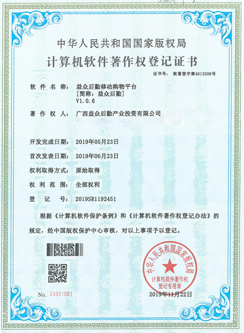 “益眾后勤移動(dòng)購(gòu)物平臺(tái)”即益眾后勤APP,是廣西益眾后勤產(chǎn)業(yè)投資有限公司與建設(shè)銀行百色分行聯(lián)合開發(fā)的線上線下交易系統(tǒng)消費(fèi)者可以通過(guò)手機(jī)APP實(shí)現(xiàn)便捷消費(fèi)。該證書的獲得是我公司在互聯(lián)網(wǎng)自主研發(fā)創(chuàng)新及自主知識(shí)產(chǎn)權(quán)保護(hù)的重大突破,是益眾后勤網(wǎng)上商城在計(jì)算機(jī)軟件領(lǐng)域里得到的權(quán)威認(rèn)可,標(biāo)志著我公司在互聯(lián)網(wǎng)軟件研發(fā)應(yīng)用領(lǐng)域邁上了一個(gè)新的臺(tái)階。