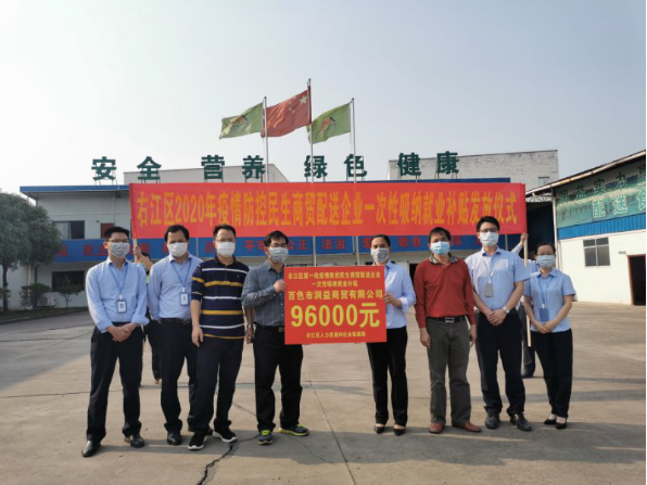 ??? 2020年2月29日,右江區(qū)人力資源和社會保障局黃彬副局長、就業(yè)服務中心黃瑞珉主任、右江區(qū)國有資產管理中心黃紹雷副主任,在潤益商貿公司舉行2020年疫情防控民生商貿配送企業(yè)一次性吸納就業(yè)補貼發(fā)放儀式。