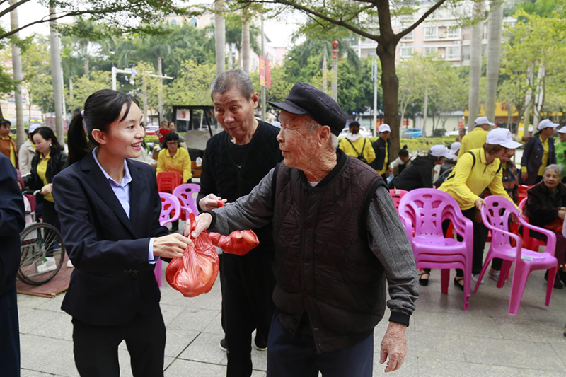 益眾托管公司的志愿者給華宇樂安老人們贈(zèng)送小禮品