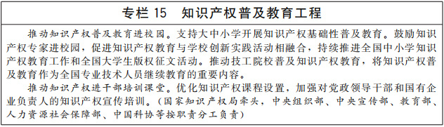 優(yōu)化知識產(chǎn)權(quán)人才發(fā)展環(huán)境。推進(jìn)知識產(chǎn)權(quán)學(xué)科建設(shè),支持學(xué)位授權(quán)自主審核單位依程序設(shè)置知識產(chǎn)權(quán)一級學(xué)科點(diǎn),支持有關(guān)單位依程序設(shè)置知識產(chǎn)權(quán)二級學(xué)科點(diǎn),研究設(shè)置知識產(chǎn)權(quán)碩士專業(yè)學(xué)位。推動知識產(chǎn)權(quán)相關(guān)專業(yè)升級和數(shù)字化改造,開發(fā)一批知識產(chǎn)權(quán)精品課程。鼓勵支持有條件的理工科高校開設(shè)知識產(chǎn)權(quán)相關(guān)專業(yè)和課程。設(shè)立一批國家知識產(chǎn)權(quán)人才培養(yǎng)基地。做好知識產(chǎn)權(quán)職稱制度改革實(shí)施工作,完善知識產(chǎn)權(quán)人才評價體系。(教育部、人力資源社會保障部、國家知識產(chǎn)權(quán)局等按職責(zé)分工負(fù)責(zé))