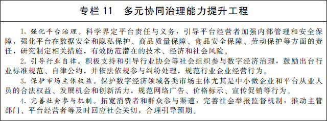 (三)完善多元共治新格局。建立完善政府、平臺、企業(yè)、行業(yè)組織和社會公眾多元參與、有效協(xié)同的數(shù)字經(jīng)濟(jì)治理新格局,形成治理合力,鼓勵良性競爭,維護(hù)公平有效市場。加快健全市場準(zhǔn)入制度、公平競爭審查機制,完善數(shù)字經(jīng)濟(jì)公平競爭監(jiān)管制度,預(yù)防和制止濫用行政權(quán)力排除限制競爭。進(jìn)一步明確平臺企業(yè)主體責(zé)任和義務(wù),推進(jìn)行業(yè)服務(wù)標(biāo)準(zhǔn)建設(shè)和行業(yè)自律,保護(hù)平臺從業(yè)人員和消費者合法權(quán)益。開展社會監(jiān)督、媒體監(jiān)督、公眾監(jiān)督,培育多元治理、協(xié)調(diào)發(fā)展新生態(tài)。鼓勵建立爭議在線解決機制和渠道,制定并公示爭議解決規(guī)則。引導(dǎo)社會各界積極參與推動數(shù)字經(jīng)濟(jì)治理,加強和改進(jìn)反壟斷執(zhí)法,暢通多元主體訴求表達(dá)、權(quán)益保障渠道,及時化解矛盾糾紛,維護(hù)公眾利益和社會穩(wěn)定。