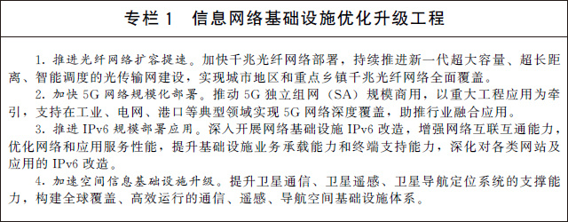(一)加快建設(shè)信息網(wǎng)絡(luò)基礎(chǔ)設(shè)施。建設(shè)高速泛在、天地一體、云網(wǎng)融合、智能敏捷、綠色低碳、安全可控的智能化綜合性數(shù)字信息基礎(chǔ)設(shè)施。有序推進(jìn)骨干網(wǎng)擴(kuò)容,協(xié)同推進(jìn)千兆光纖網(wǎng)絡(luò)和5G網(wǎng)絡(luò)基礎(chǔ)設(shè)施建設(shè),推動5G商用部署和規(guī)模應(yīng)用,前瞻布局第六代移動通信(6G)網(wǎng)絡(luò)技術(shù)儲備,加大6G技術(shù)研發(fā)支持力度,積極參與推動6G國際標(biāo)準(zhǔn)化工作。積極穩(wěn)妥推進(jìn)空間信息基礎(chǔ)設(shè)施演進(jìn)升級,加快布局衛(wèi)星通信網(wǎng)絡(luò)等,推動衛(wèi)星互聯(lián)網(wǎng)建設(shè)。提高物聯(lián)網(wǎng)在工業(yè)制造、農(nóng)業(yè)生產(chǎn)、公共服務(wù)、應(yīng)急管理等領(lǐng)域的覆蓋水平,增強固移融合、寬窄結(jié)合的物聯(lián)接入能力。