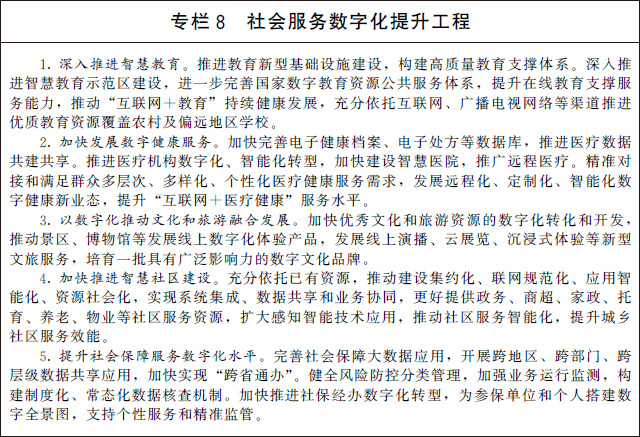 (二)提升社會服務(wù)數(shù)字化普惠水平。加快推動文化教育、醫(yī)療健康、會展旅游、體育健身等領(lǐng)域公共服務(wù)資源數(shù)字化供給和網(wǎng)絡(luò)化服務(wù),促進(jìn)優(yōu)質(zhì)資源共享復(fù)用。充分運用新型數(shù)字技術(shù),強化就業(yè)、養(yǎng)老、兒童福利、托育、家政等民生領(lǐng)域供需對接,進(jìn)一步優(yōu)化資源配置。發(fā)展智慧廣電網(wǎng)絡(luò),加快推進(jìn)全國有線電視網(wǎng)絡(luò)整合和升級改造。深入開展電信普遍服務(wù)試點,提升農(nóng)村及偏遠(yuǎn)地區(qū)網(wǎng)絡(luò)覆蓋水平。加強面向革命老區(qū)、民族地區(qū)、邊疆地區(qū)、脫貧地區(qū)的遠(yuǎn)程服務(wù),拓展教育、醫(yī)療、社保、對口幫扶等服務(wù)內(nèi)容,助力基本公共服務(wù)均等化。加強信息無障礙建設(shè),提升面向特殊群體的數(shù)字化社會服務(wù)能力。促進(jìn)社會服務(wù)和數(shù)字平臺深度融合,探索多領(lǐng)域跨界合作,推動醫(yī)養(yǎng)結(jié)合、文教結(jié)合、體醫(yī)結(jié)合、文旅融合。