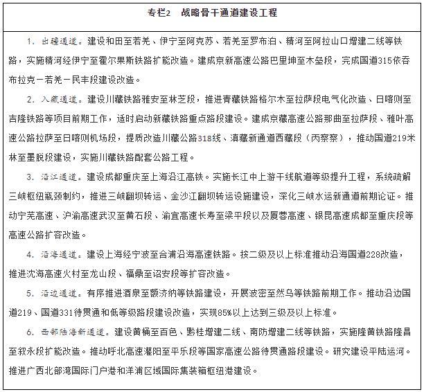 加強(qiáng)戰(zhàn)略骨干通道建設(shè)。推進(jìn)出疆入藏通道建設(shè),擴(kuò)大甘新、青新、青藏、川藏四條內(nèi)聯(lián)主通道通行能力,穩(wěn)步推進(jìn)川藏鐵路建設(shè),加快推進(jìn)新藏鐵路和田至日喀則段前期工作、適時啟動重點路段建設(shè),有序推進(jìn)滇藏鐵路前期工作,密實優(yōu)化航空航線網(wǎng)絡(luò)布局,構(gòu)建多向聯(lián)通的通道布局。暢通沿江通道,加快建設(shè)沿江高鐵,優(yōu)化以高等級航道和干線鐵路、高速公路為骨干的沿江綜合運輸大通道功能。升級沿海通道,提高鐵路通道能力,推進(jìn)高速公路繁忙路段擴(kuò)容改造,提升港口航道整體效能,構(gòu)建大容量、高品質(zhì)的運輸走廊。貫通沿邊通道,提級改造普通國省干線,推進(jìn)重點方向沿邊鐵路建設(shè),提高安全保障水平。建設(shè)西部陸海新通道,發(fā)揮鐵路在陸路運輸中的骨干作用和港口在海上運輸中的門戶作用,強(qiáng)化東、中、西三條通路,形成大能力主通道,銜接國際運輸通道。